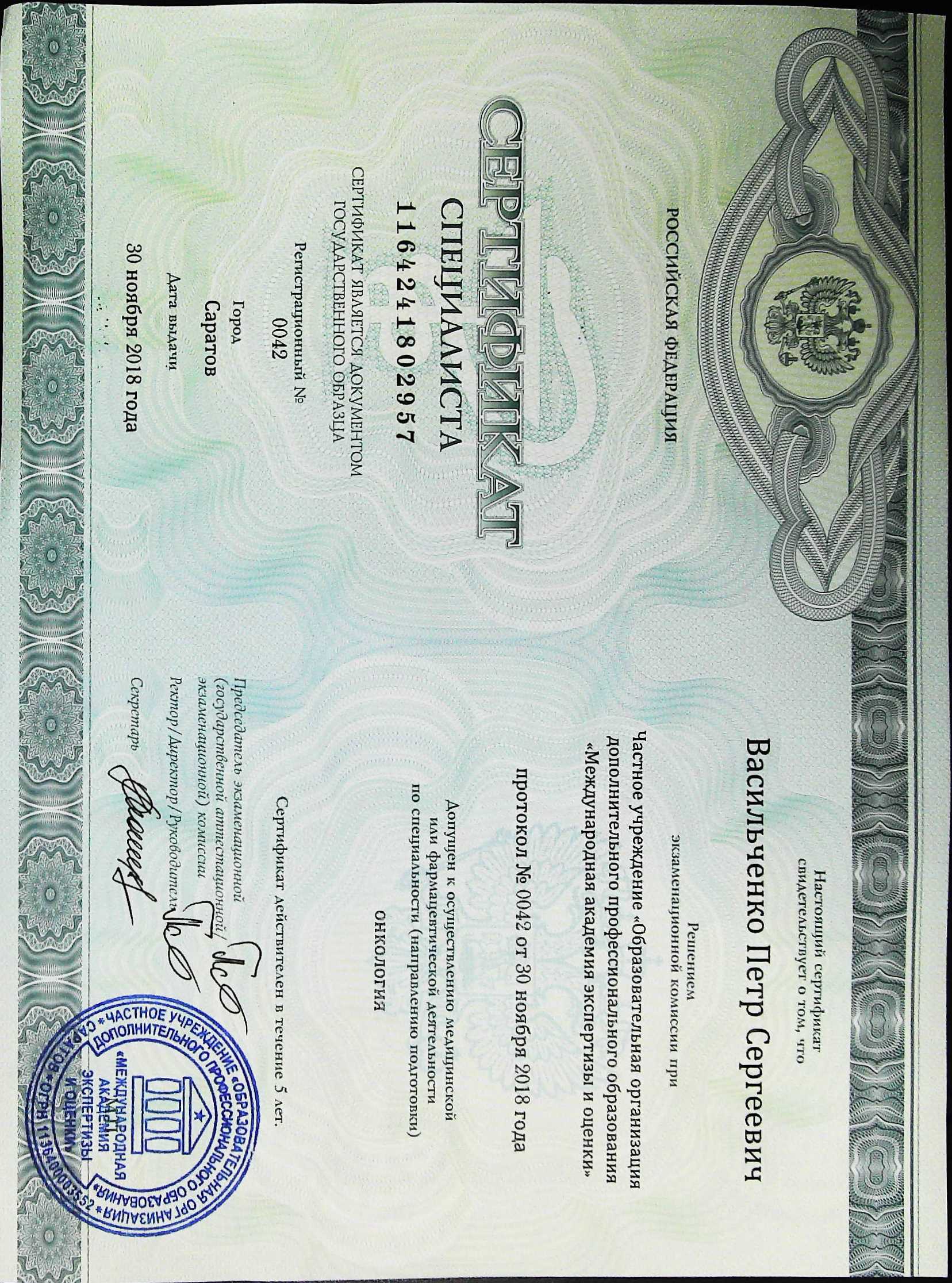 По специальности «Дерматовенерология» Сертификат действителен 5 лет.